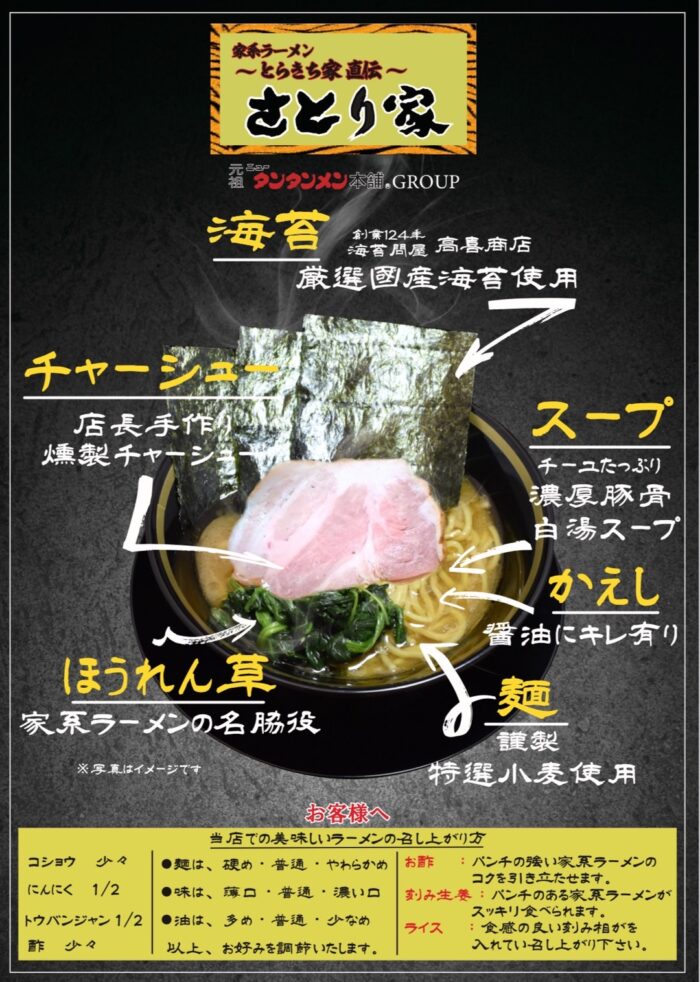 出店情報 2025.10.07 家系ラーメン〜とらきち家直伝〜「さとり家」 五反田店オープンのお知らせ 10月10日より元祖ニュータンタンメン本舗 五反田店、同店舗内にて、家系ラーメン〜とらきち家直伝〜さとり家 五反田店がオープンいたします。 横浜・白楽で人気の「とらきち家」さんから直接味を教わり、”とらきち家直伝”の本格家系ラーメンをご提供いたします。 皆様のご来店を心よりお待ちしております。 営業時間:11:30〜14:30/17:30〜23:00 定休日:日曜日